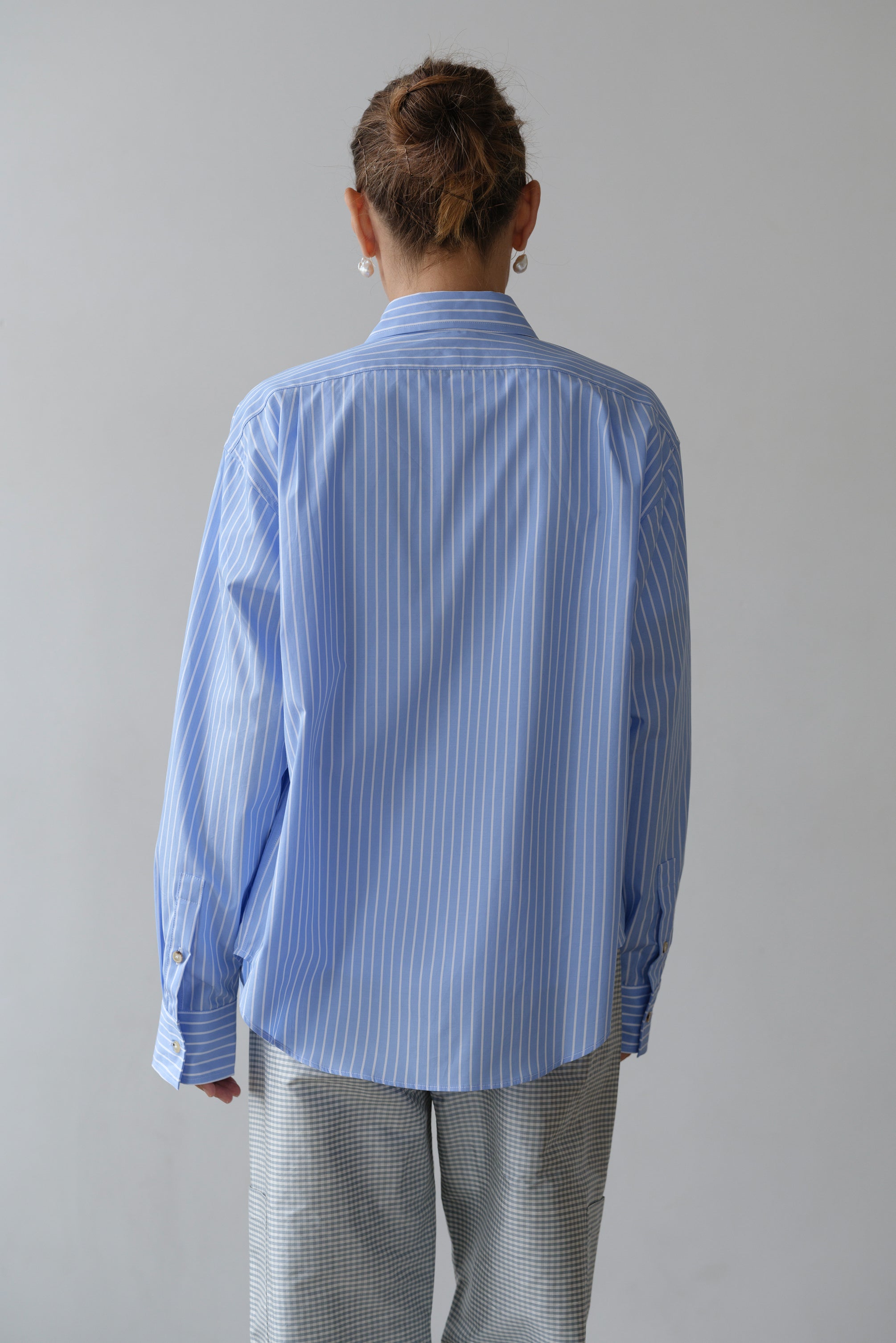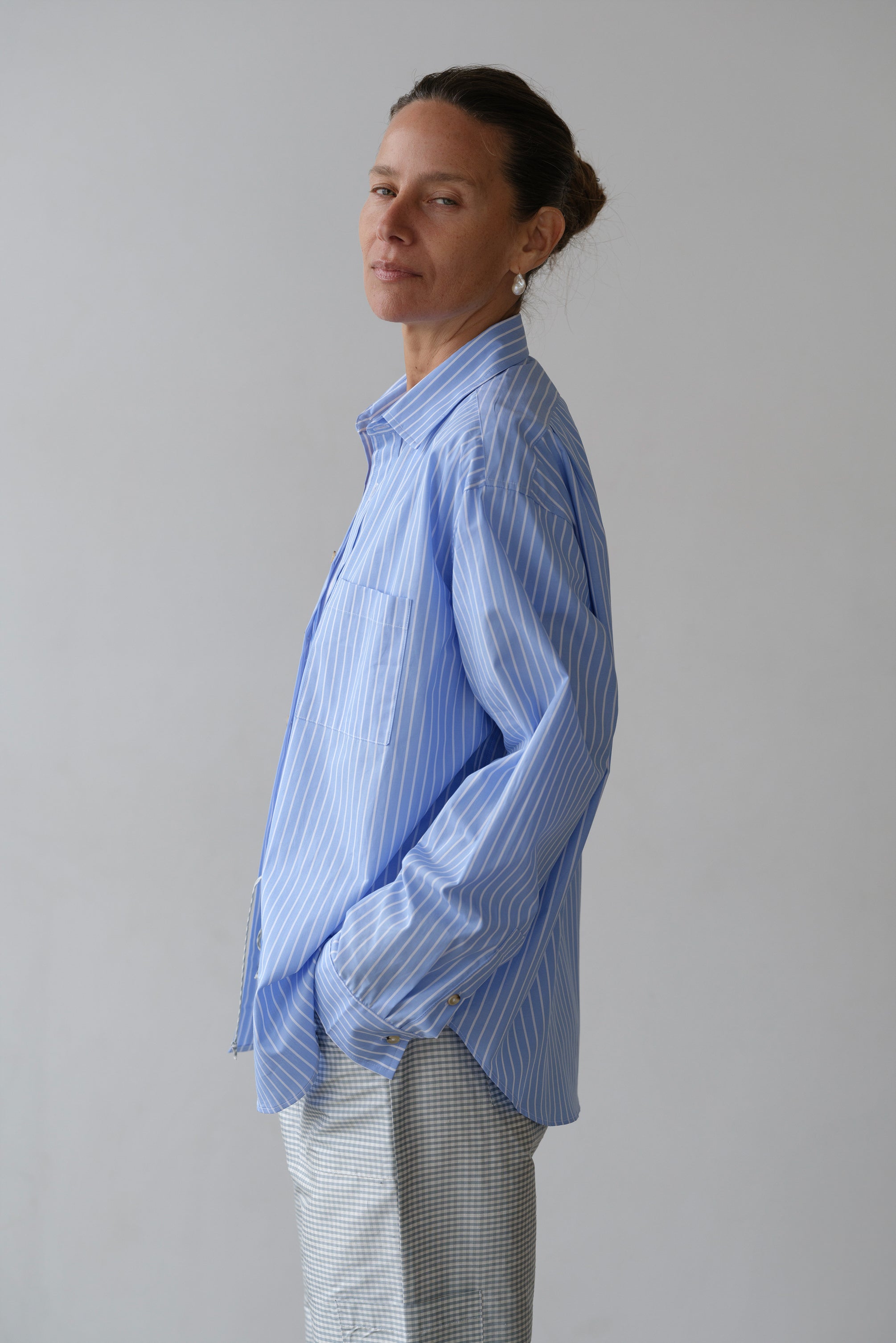 a back yoke with double pleats, a front square pocket, tortoise buttons, and pleated cuffs. Inspired by